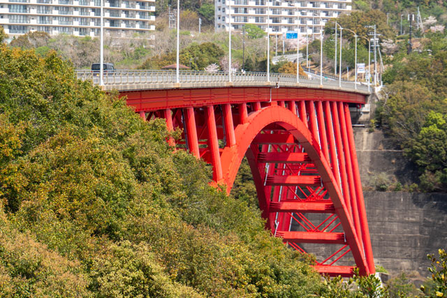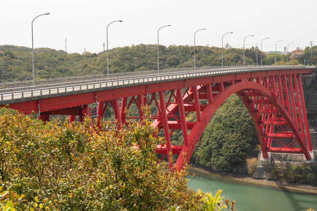 的矢湾大橋は、パールロードのスペイン村手前(鳥羽側)にかかる、長さ237.6mの赤い橋です。