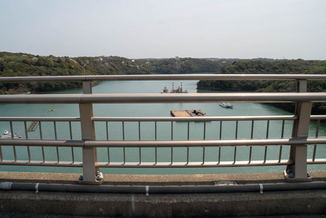 また、橋の片側(東側)には歩道があり、そこから的矢湾を眺めることが出来ます。下の写真です。