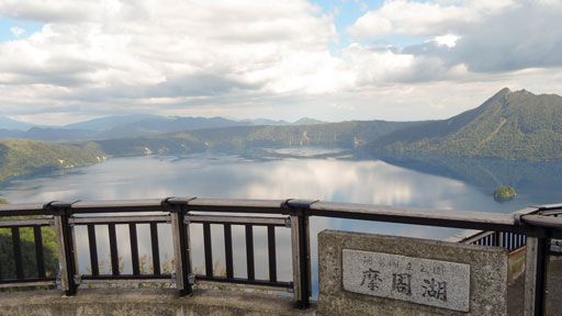 第三展望台(下の写真)にも行ってみたものの、ちょっと全体的に違いますよね。裏摩周展望台には時間の関係で行けませんでしたが、写真を検索したところ、島の位置はゲーム画面に近いのですが、やはり山の形が違うようです。