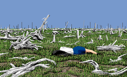 トドワラとは、海水の浸食により立ち枯れたトドマツの林です。2014年現在ではほとんど残っておらず、所々で骨のような枯れ木の残骸が地面に倒れているばかりでした。ただ、ゲーム画面に何となく近い感じで、立ち枯れたままの幹が何本か残っていた場所があったので、これはと思って写真を撮ってきました。