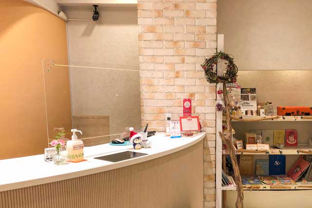 ホテルのフロントの脇には、別府グッズ(おみやげ)や観光ガイドなどが並んだ棚があります。