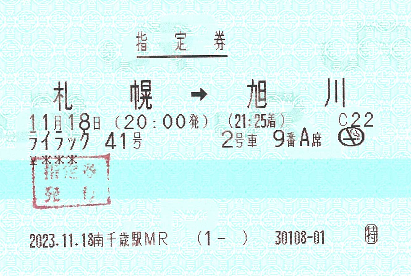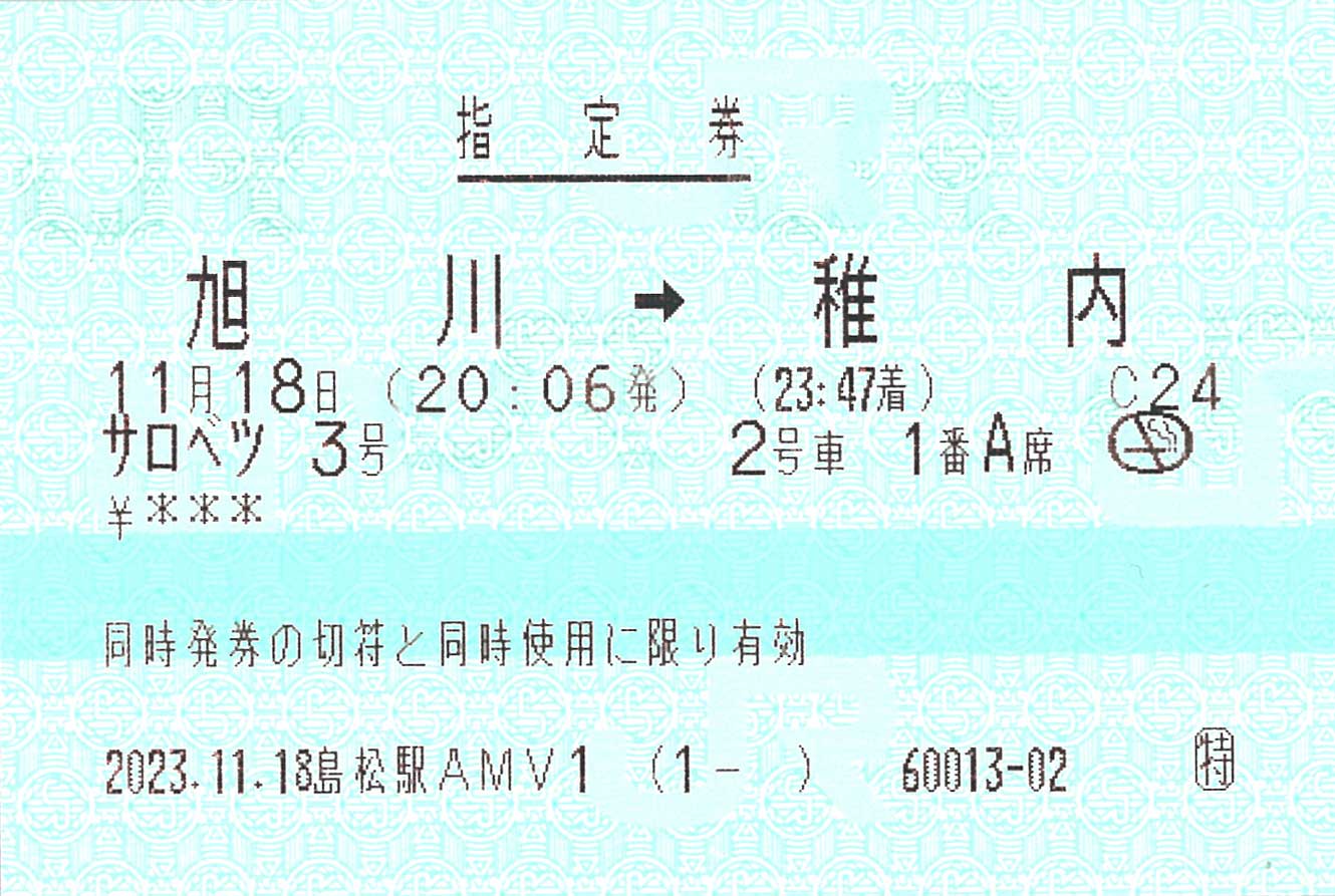 旭川での乗り換えが必要なので2枚発券されていますが、指定席発行回数は1回としてカウントされています。